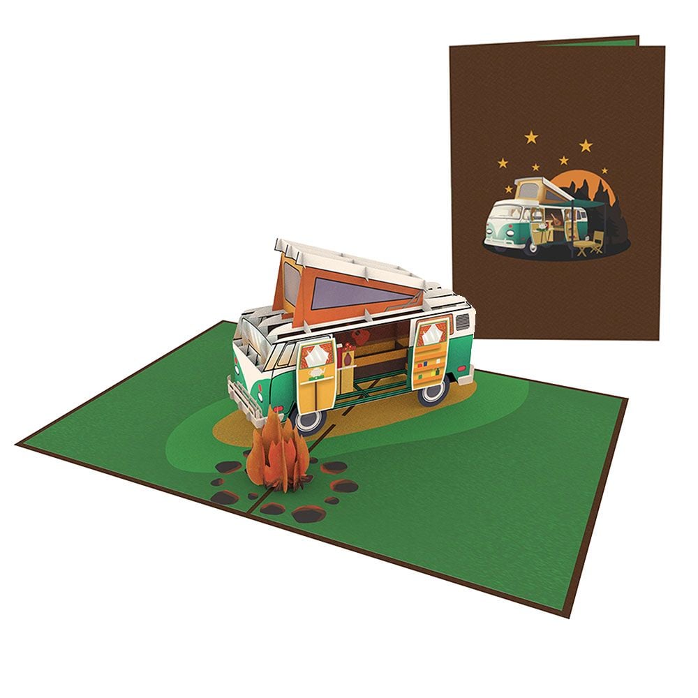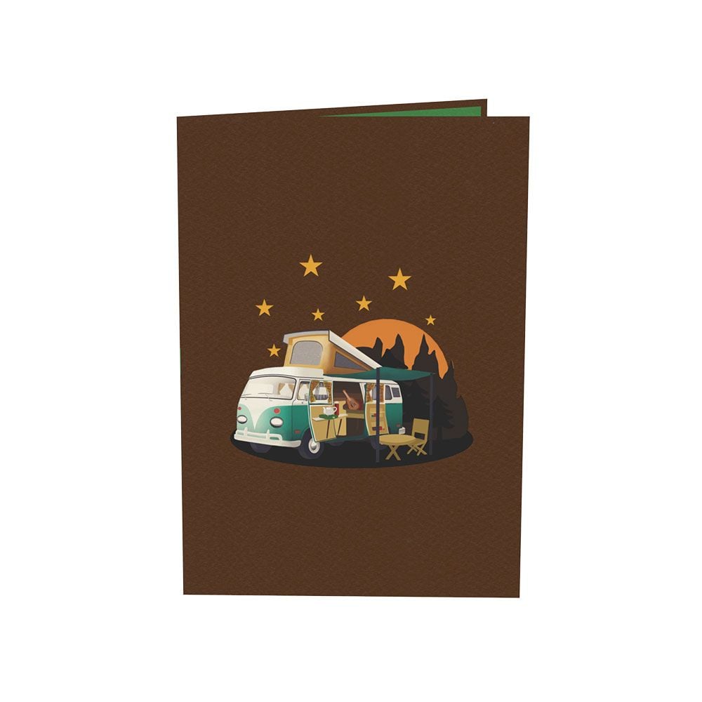 Open the card and be amazed by a stunning 3D pop-up of a fully detailed camper van complete with pop-up roof, side awning, and tiny accessories like lanterns and chairs. Sitting beside the camper is a charming campfire scene with 3D flame cutouts and printed shadows. The ground beneath the camper features a soft green landscape, bringing to life the warmth and joy of being outdoors. Whether you're a vanlife enthusiast or someone who simply loves cozy getaways, this card will spark joy and nostalgia.