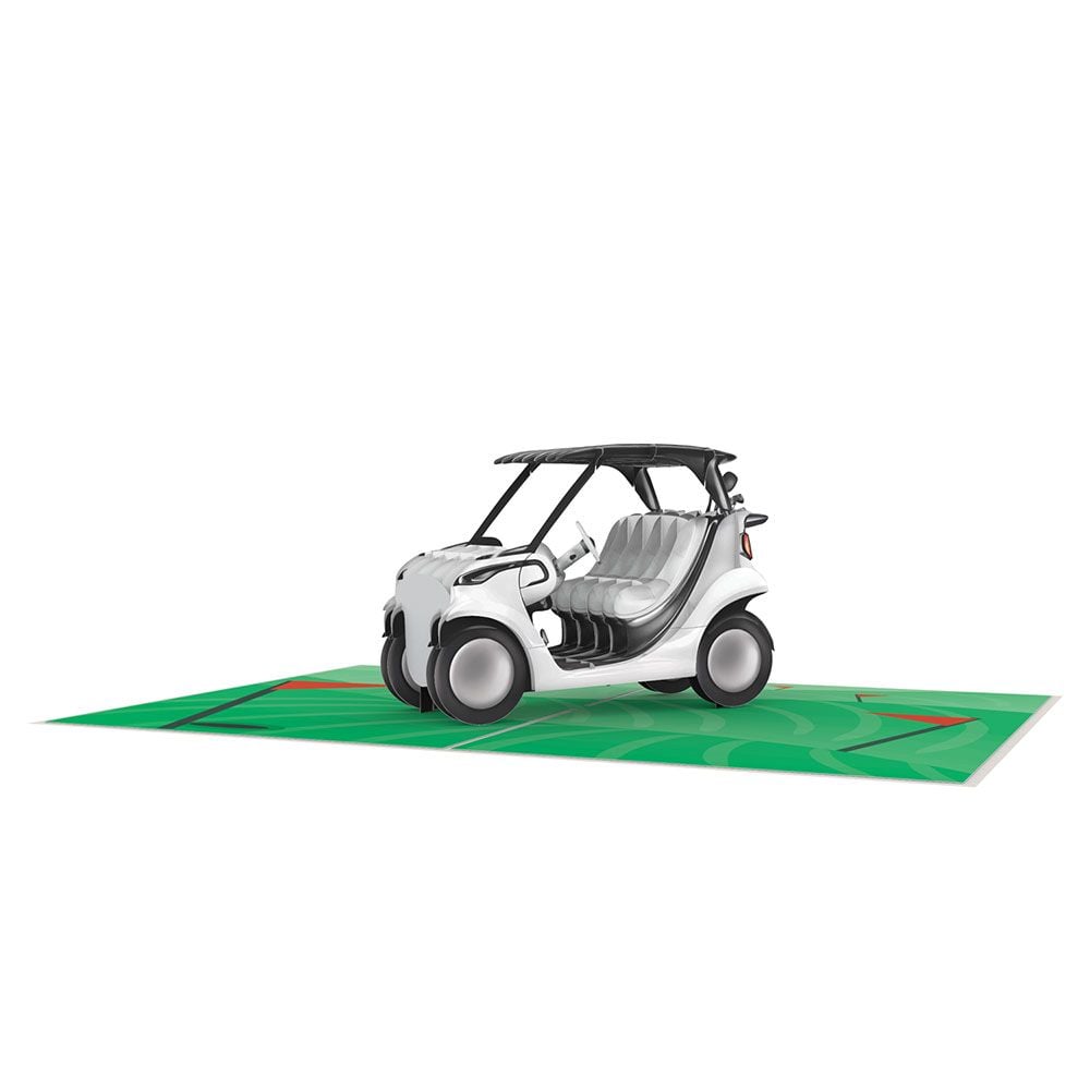 Open the card to reveal an expertly crafted 3D golf cart rising from a vibrant green fairway base. Every detail is thoughtfully designed, from the contour of the golf seats to the club set positioned neatly in the back of the cart. The lush green background mimics a real golf course, complete with fairway markings, offering a perfect environment for this charming miniature vehicle.