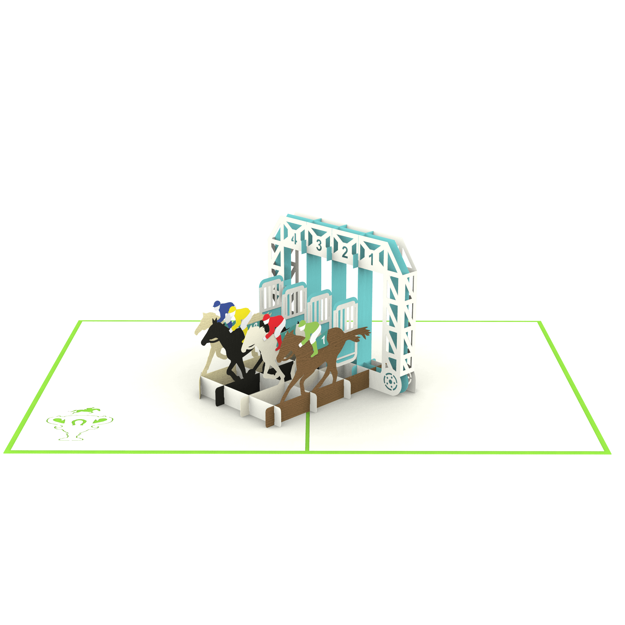 Once opened, the card springs to life with an intricate 3D depiction of four racehorses bursting out of the starting gate. Each horse, with its own jockey dressed in distinctive colors, gallops forward from a detailed paper-crafted starting line structure. The turquoise gate is accented with white trusses and labeled gates (1 to 4), giving the illusion of a real race track moment frozen in time.