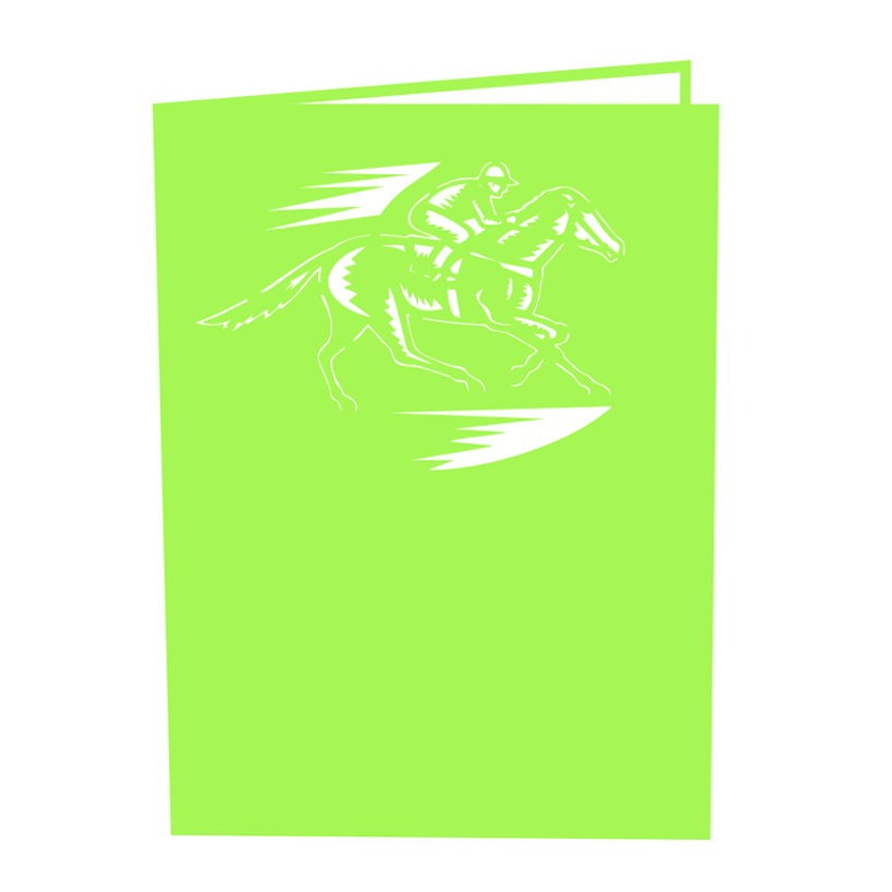 The cover of the Race Day Pop Up Card is a vibrant neon green that immediately grabs attention. At the center, a clean white laser-cut silhouette of a jockey riding a racing horse captures the dynamic motion and elegance of a high-stakes race. The minimalistic yet energetic artwork conveys both modernity and timeless tradition—setting the tone for the excitement inside.