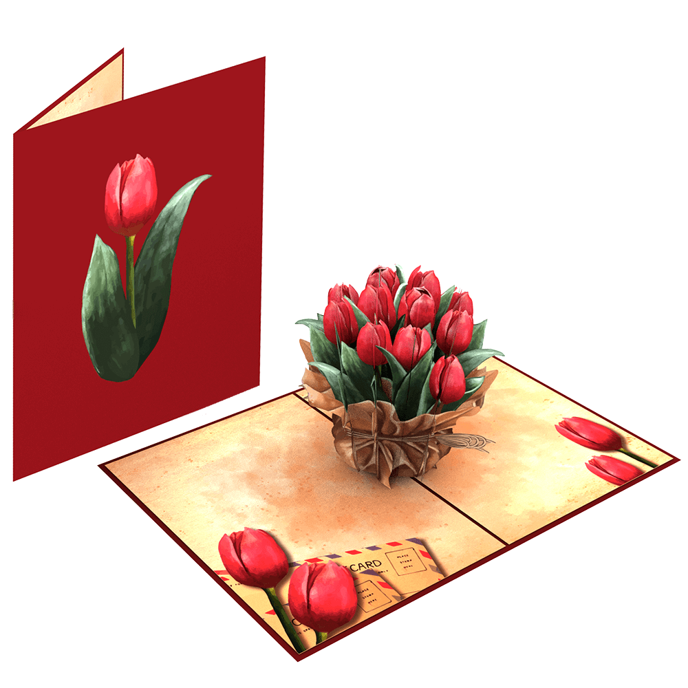 Each Red Tulips Pop Up Card is created using precision laser-cutting technology and hand-assembled by skilled artisans. The design folds completely flat for mailing and storage, yet opens into a dimensional bouquet with seamless structure and detail. The construction is robust, so your card remains beautiful for years—no wilting or fading like real flowers.